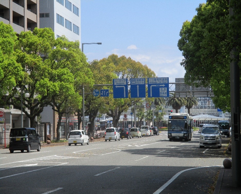 宮崎駅前から市街地に延びる高千穂通り。会社への通勤は、この道を通り徒歩約8分。