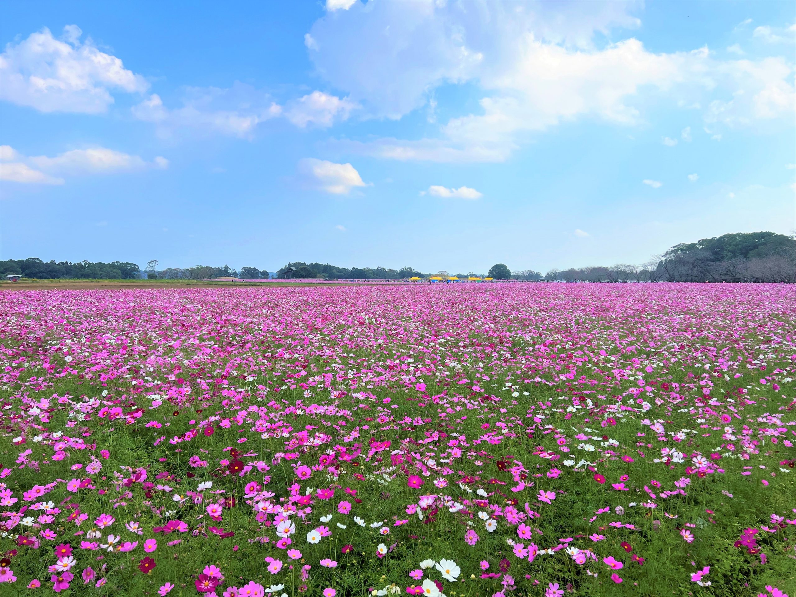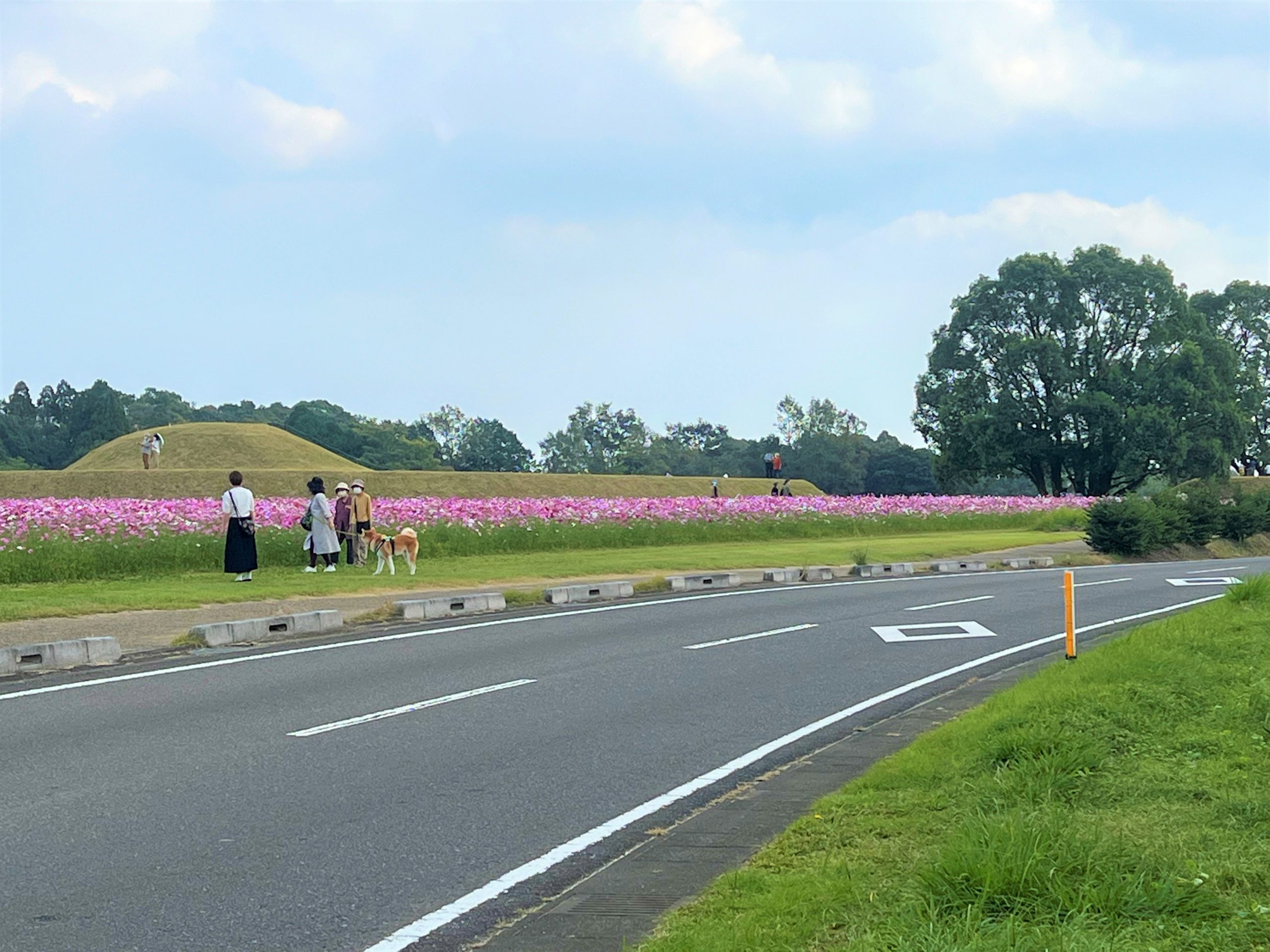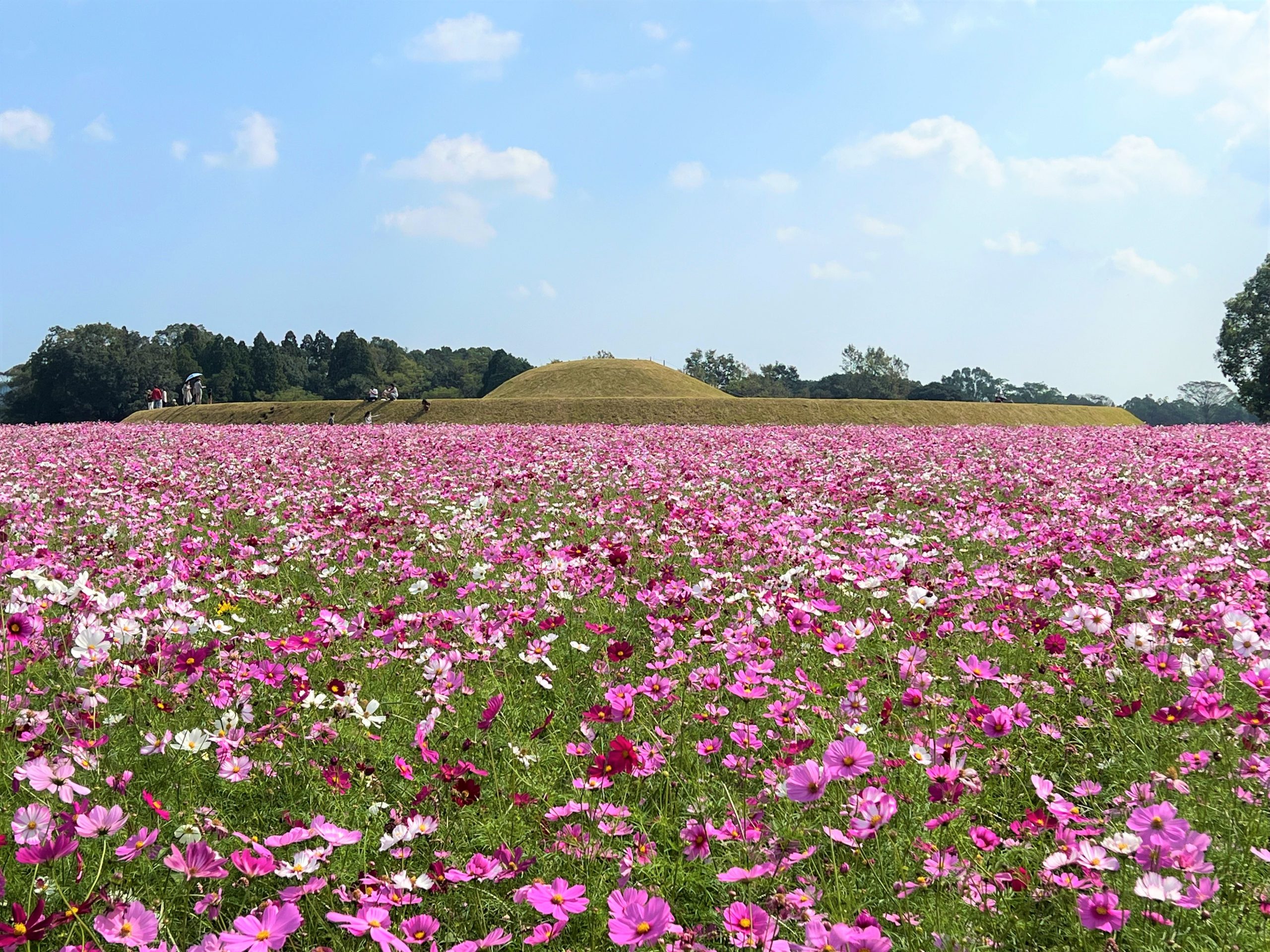 西都原古墳群のコスモスは11月上旬に開催される「西都古墳まつり」に合わせて植え付けられるため、10月下旬が見頃となります。