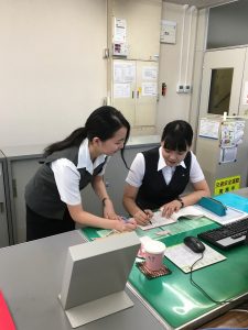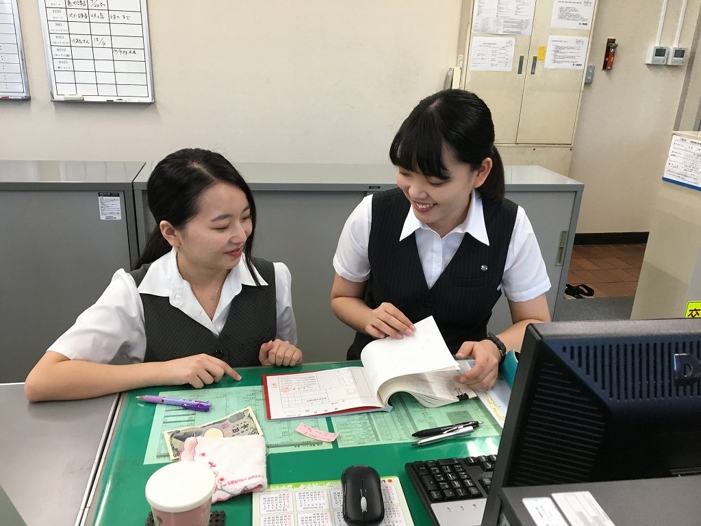 配属先の総務課で、昨年入社した先輩の指導を仰ぎながら、業務に励む新人さん(写真右)。
