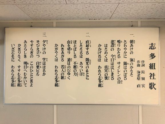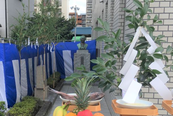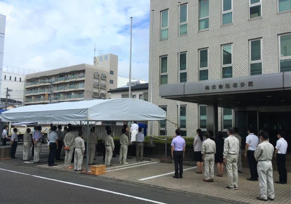 慰霊碑と創業者「志多熊吉翁」の塑像前にて
