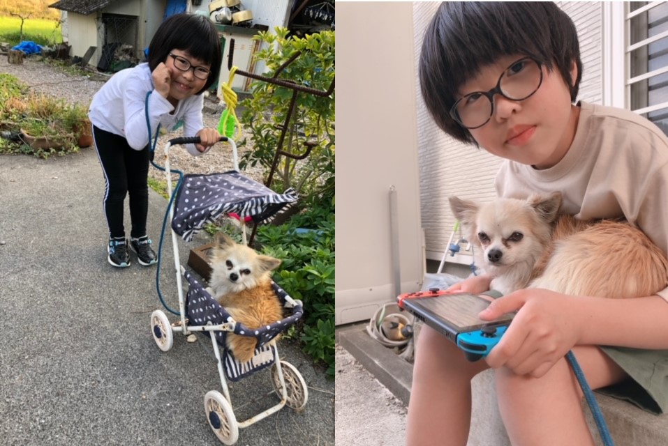 (左)更に1年後、人形用ベビーカーでお散歩のリンク君(7才)紡ちゃん(6才)!