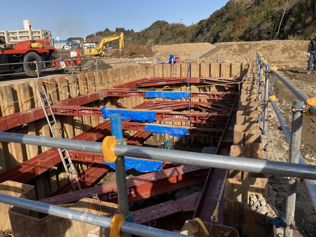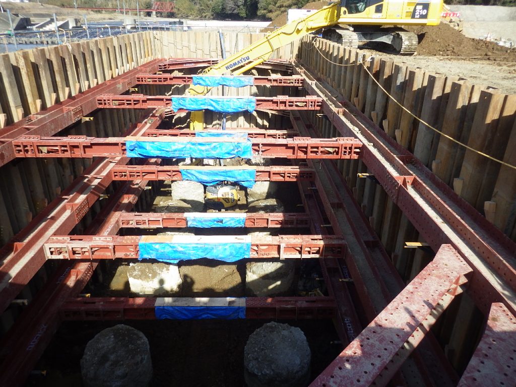 土や水をせき止める資材(シートパイル、腹起し・切梁・火打ち)などが設置され、