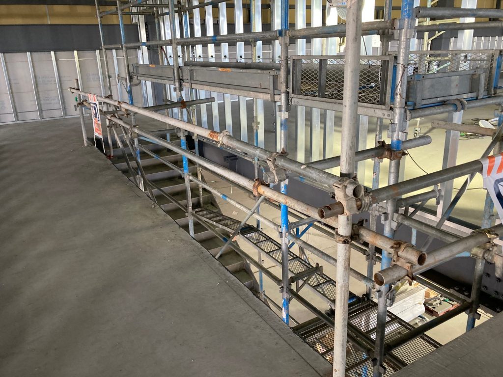 写真をご覧の通り、建築現場には高所作業時の「足場」が必要不可欠です。