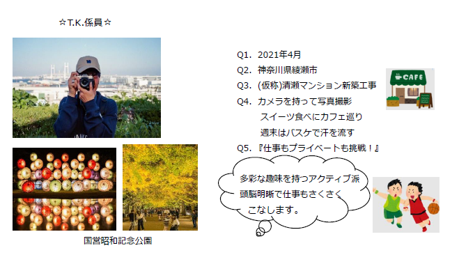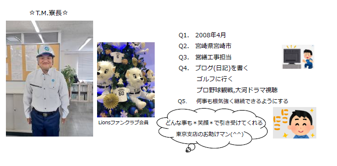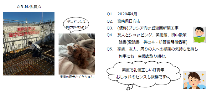 Q1.入社年月 Q2.出身地 Q3.担当現場 Q4. オフの過ごし方 Q5.今年の抱負