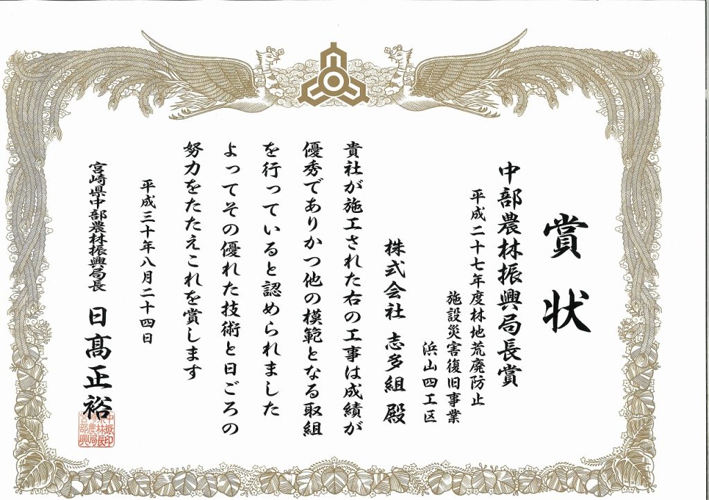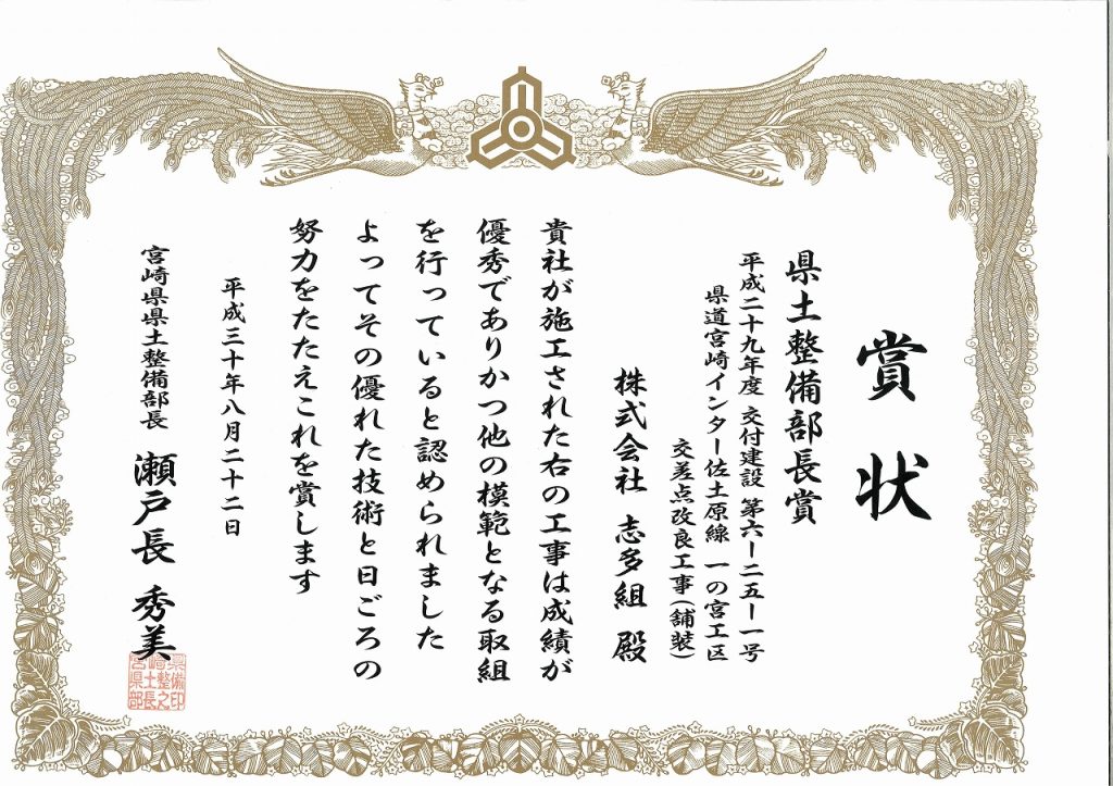 平成30年度宮崎県優良工事 「県土整備部長賞」 及び 「中部農林振興局長賞」 を受賞し、先日表彰式が執り行われました。 (宮崎県の記事はこちら)