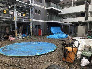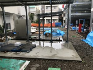 立体駐車場・ターンテーブル・駐輪機を組立、これからアスファルト舗装を施工していきます。