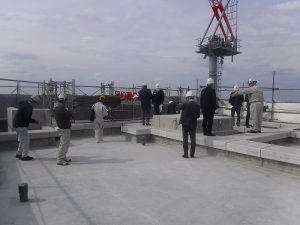 最初の2枚は14階コンクリート打設完了後の上棟時のR階スラブ上と建物外観写真(2019年3月30日撮影)です。