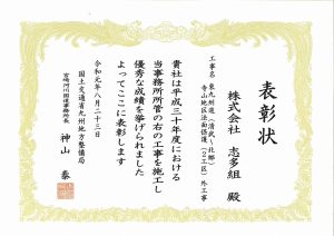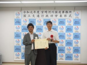 令和元年8月23日、国土交通省 九州地方整備局 宮崎河川国道事務所にて開催された「令和元年度 宮崎河川国道事務所 国土交通行政功労表彰式」に於いて、上記の工事を施工した当社が「優良施工業者」として表彰されました。