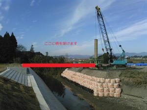 これは、本庄川を跨(また)ぐ工事の第一歩の施工となります。