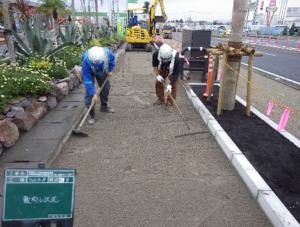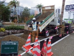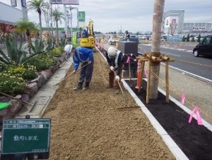 掘削完了後、ダンプトラックにてフィルター層(砂t=7㎝)を搬入し、バックホー及び人力にて敷均し、転圧機械にて締固めます。