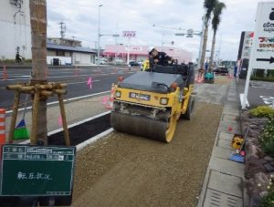 フィルター層施工完了後、ダンプトラックにて路盤材(砕石t=10㎝)を搬入し、バックホー及び人力で敷均し、転圧機械にて締固めます。