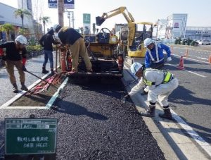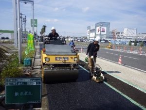 路盤工完了後、透水性舗装(アスファルトt=4㎝)をアスファルトフィニッシャー及び人力で敷均し転圧機械にて締固めます。
