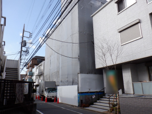 外部足場の解体前は前面道路が狭く、搬入搬出には大変苦労しました。