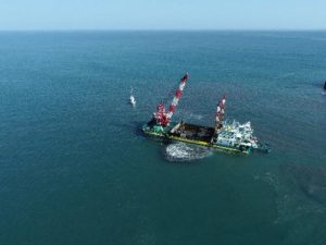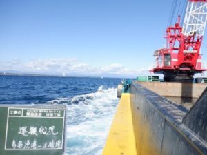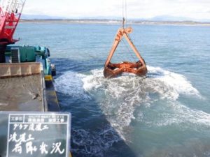 掘り方もグラブ浚渫(砂を掴んで積込む方法)とポンプ浚渫(砂を吸い込む方法)とありますが、今回はグラブ浚渫という方法で施工を行っていきます。