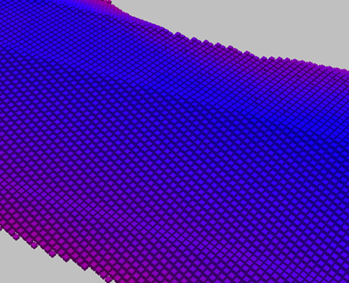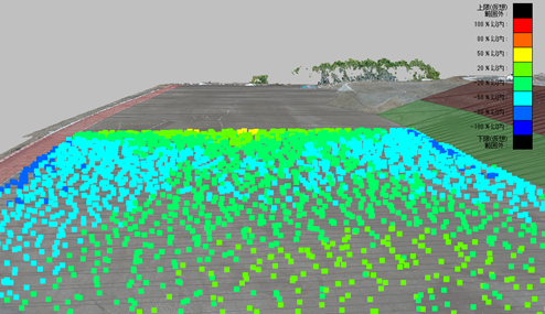 この柱の設計面と点群面の高低差に柱の面積(0.5m×0.5m)をかけたものを集計して全体土量(切土量と盛土量に分かれる)を算出します。