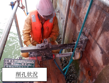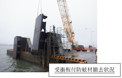 それではまず設置されている「受衝板付防舷材」の撤去作業を行います。