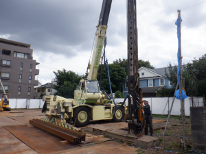 ▼山留工事(H形鋼打設中)