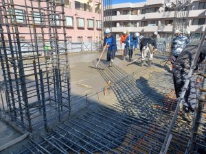 コンクリートがスラブまで上がって来たら、土間工で平坦に均していきます。