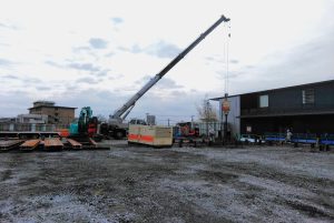 「山留工事」とは、基礎工事を行う前に掘削を行う際、側面を保護し、周囲の地盤の崩壊や土砂の流出を防ぐための工事のことで、今回は6mのH鋼を149本打ち込みました。