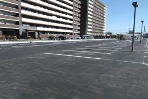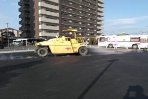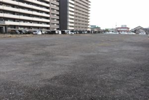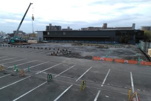 今回、これまで既存建物の駐車場として利用されていた場所に建物を増築するため、まずは2月より先行して、敷地北側に新設するアスファルト舗装の駐車場(115台分)工事に着手しました。