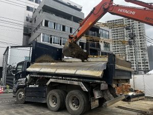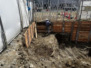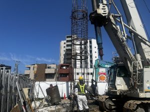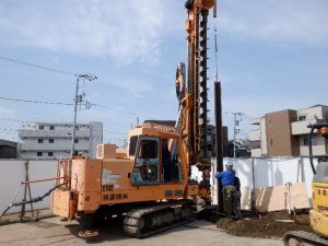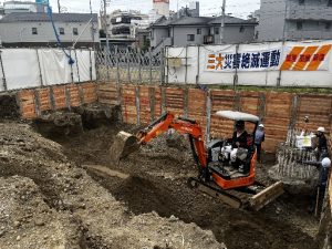 着工してすぐに山留工事を行い、GW明けに杭工事が終了し、現在は根伐り工事を行って