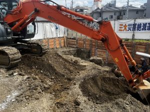 根伐り工事(大型の重機と小型の重機を使って掘削中)