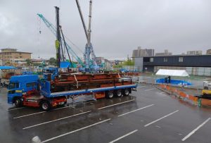 鉄骨は都城市の製作工場より大型トレーラーにて搬入し、現在も継続中です。