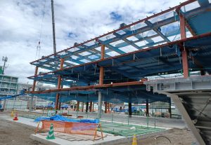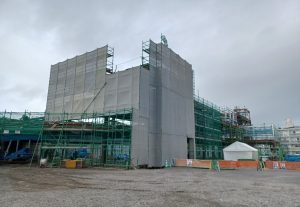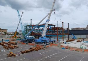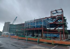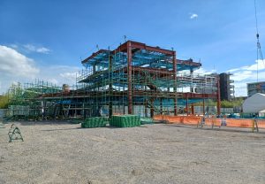前回の報告から継続して鉄骨建て方を行いながら、それを追いかける形で東側より外部