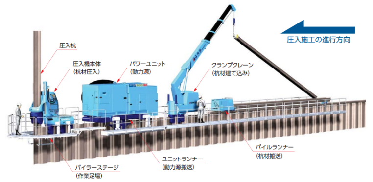 ノンステージング工法は圧入工程に関わる施工機械すべてが完成杭の