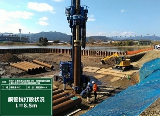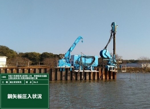 ・鋼矢板打設・・遊水池に鋼矢板を圧入(ノンステージング工法)