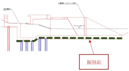 ③鋼管杭圧入完了後、構造物の床付け面まで掘削を行います。