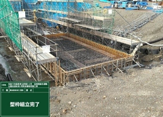 現在も開水路、排水機場の鉄筋・型枠、支保工の組立、コンクリート打設作業を行っている所です。