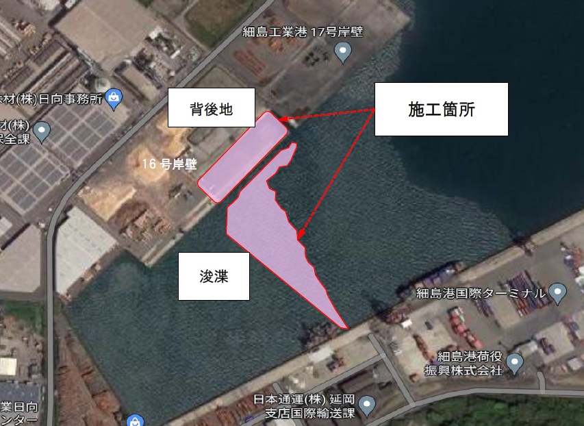 今回は、「令和4年度改修重要第1-1-1-6号細島港 白浜地区16号岸壁泊地浚渫工事」の工事を、現場メンバー・施工場所・工事概要・近くの観光スポットの4つに分けて紹介していきます。