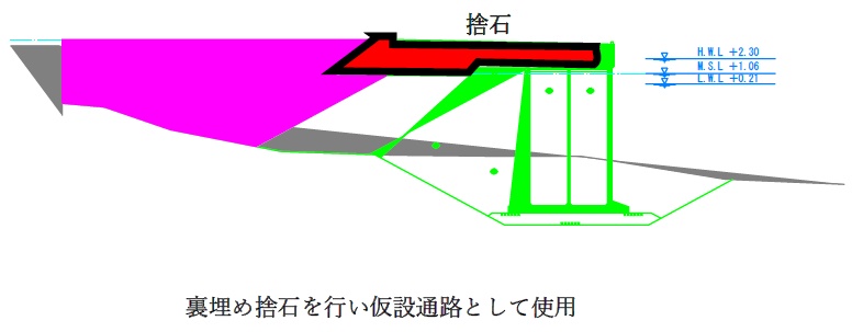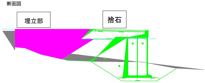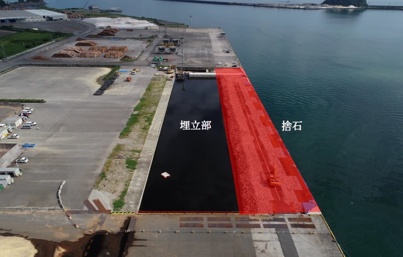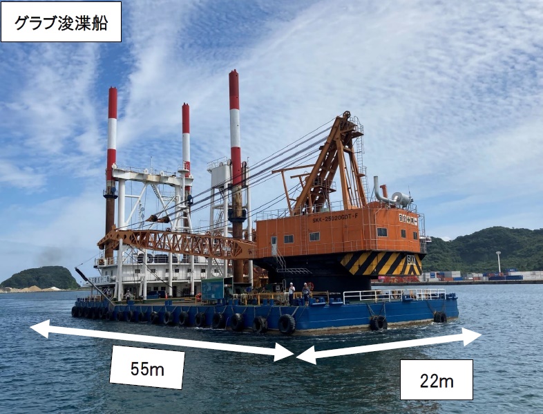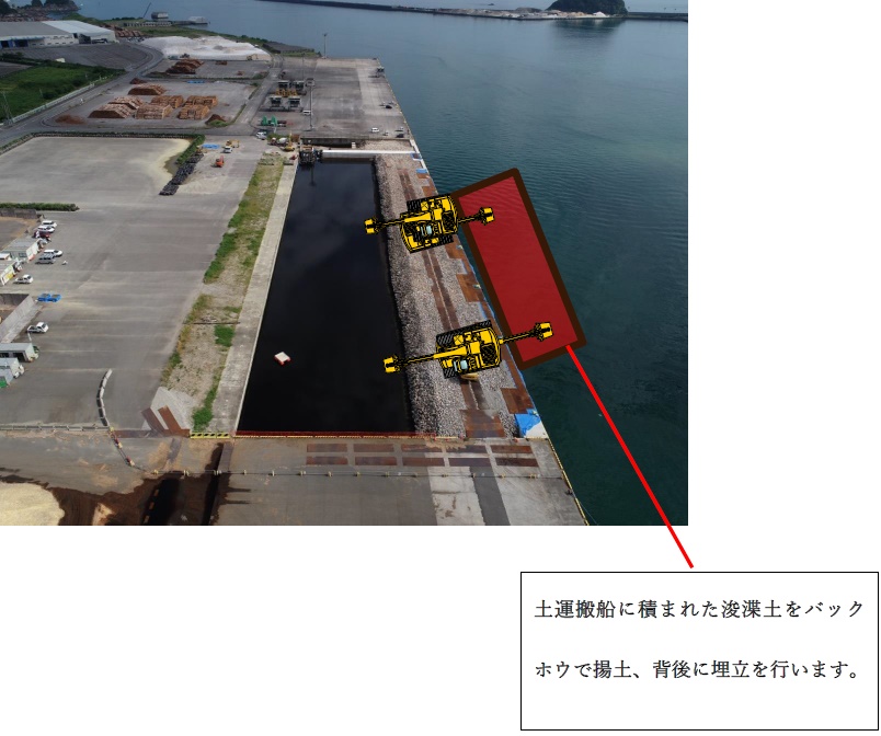 本工事は、泊地内に堆積した土砂を掘削し背後地に埋立をするという工事です。