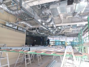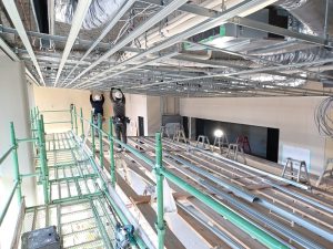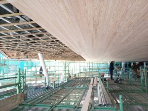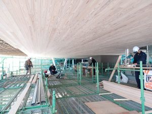 1階の内部ではレストランとロビーの斜め天井の下地を行っております。
