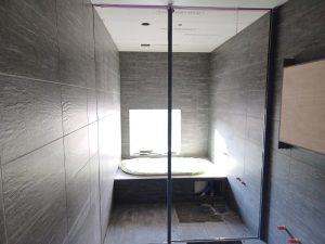 プールでは防水工事を行い、その後、壁床共にモザイクタイルを施工します。