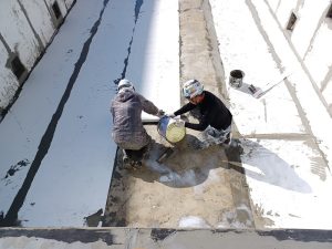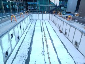 プールの防水はシート防水で、ポリマーセメントペーストで接着する工法です。