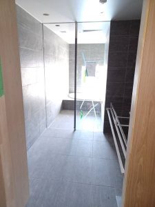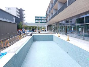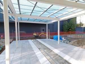 南側はパーティーテラス屋根(波板ガラス)を完了し、現在床のタイル張り施工中です。